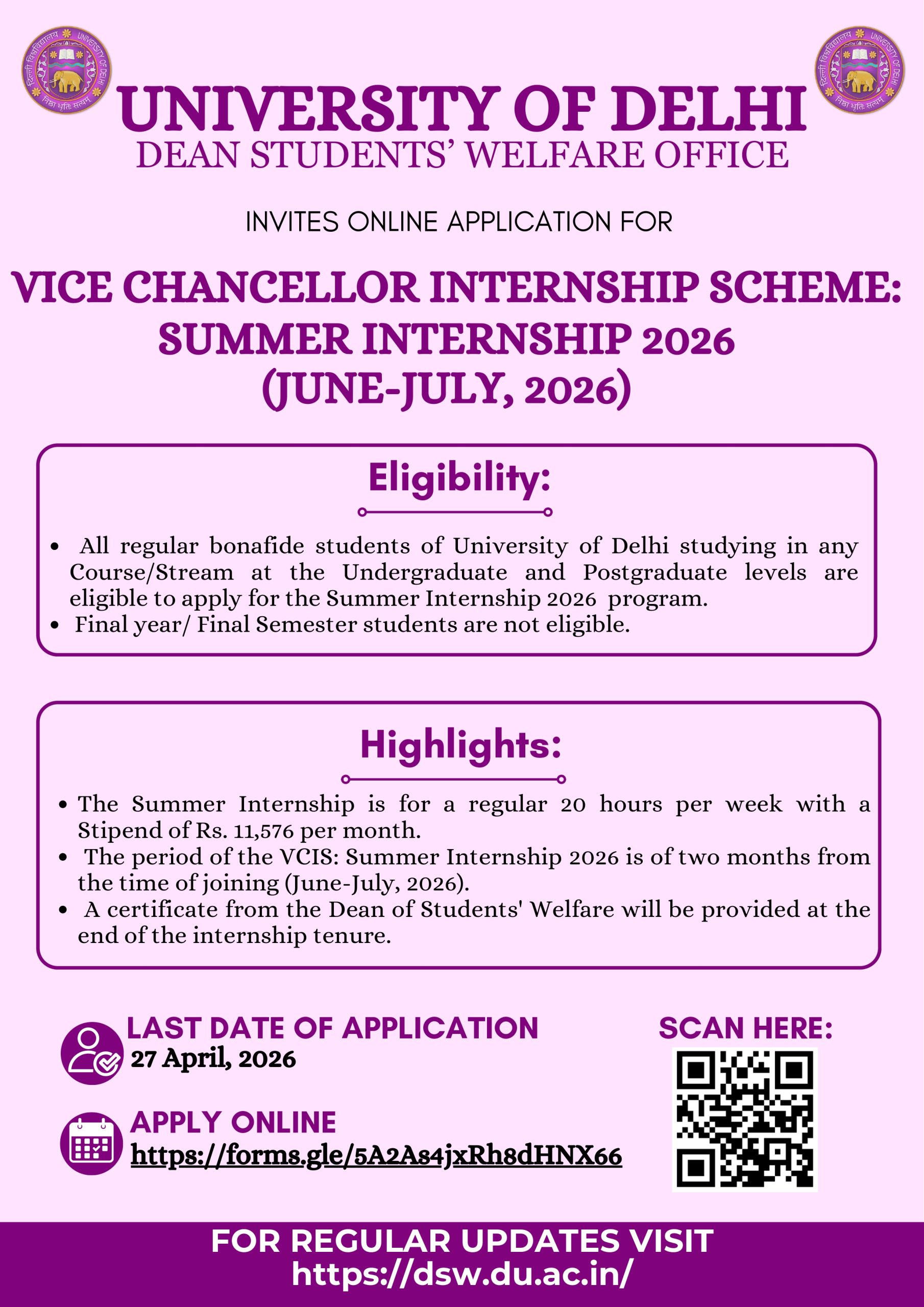 University of Delhi invites applications for VC Internship 2025: UG/PG students, 8–10 hrs/week, ₹5,775 stipend, six months, apply online by 23rd September 2025.