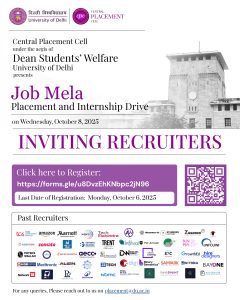 We are pleased to extend an invitation to your esteemed organization to participate in the Campus Recruitment Drives 2025–26, organized by the Central Placement Cell (CPC) under the aegis of the Dean of Students’ Welfare, University of Delhi. The dates and the timings of the recruitment drive will be notified shortly.