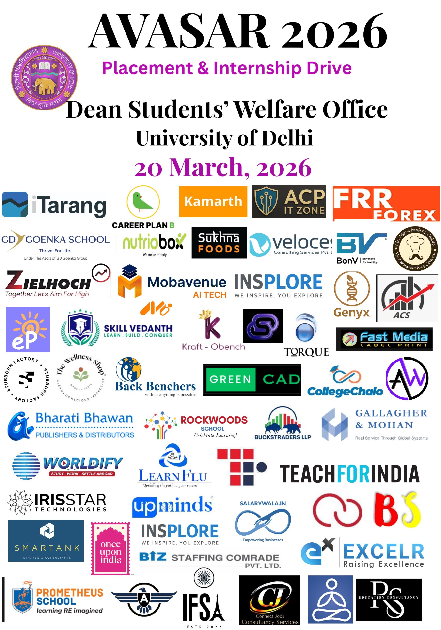 The Central Placement Cell (CPC), University of Delhi, under the aegis of Dean Students’ Welfare Office is delighted to announce the commencement of a regular update mechanism for internship and placement opportunities.